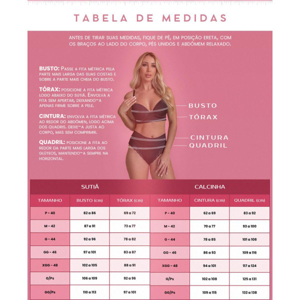 Atenção: Alguns detalhes e rendas podem sofrer alterações por parte do fornecedor, permanecendo os mesmos modelos de peças, sem tempo hábil para serem atualizadas em nosso site.