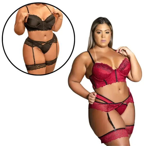 Descubra a exuberância e o conforto incomparáveis deste Conjunto Cropped e Calcinha em Renda com Liga e Perneira da nossa exclusiva Linha Plus Size. Feito sob medida para elevar sua confiança e sensualidade, este conjunto é uma ode à elegância e ao conforto.