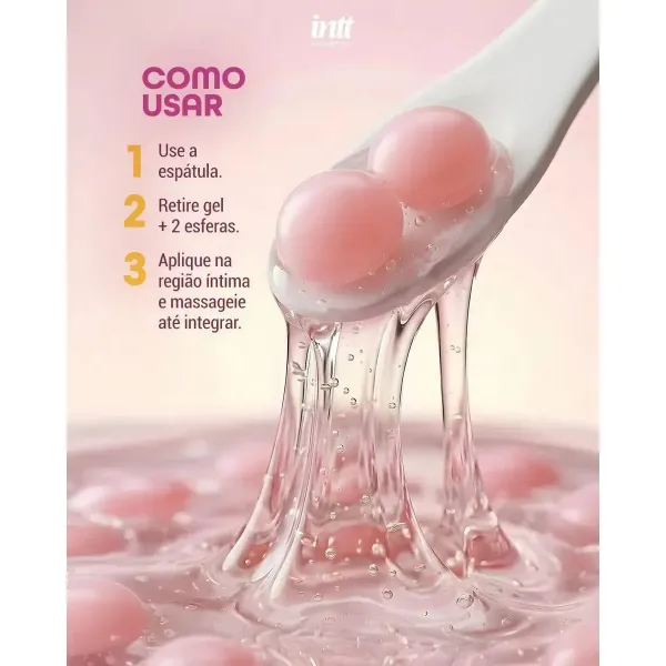 Com a espátula, retire uma quantidade generosa do gel junto com as esferas. Aplique na região desejada e espalhe suavemente. Durante o contato e a fricção, as esferas são ativadas e começam a liberar suas sensações de forma progressiva.