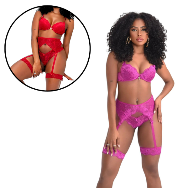 Contém: 1 conjunto de calcinha e sutiã, 1 cinta-liga