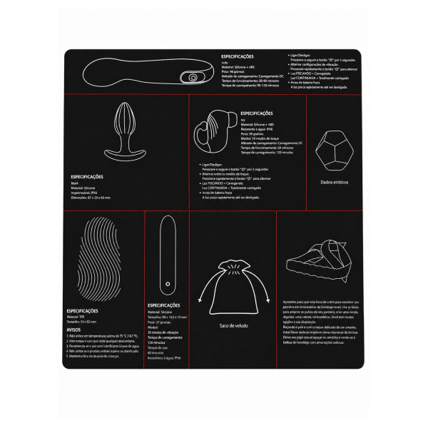 Toys em silicone e ABS, acessórios têxteis (máscara e bolsa em veludo), dados em material resistente e embalagem premium.
